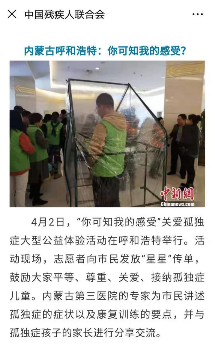 2019年3月30日世界自闭症日“你可知我的感受”主题活动方案,被中国残疾人联合会采纳。