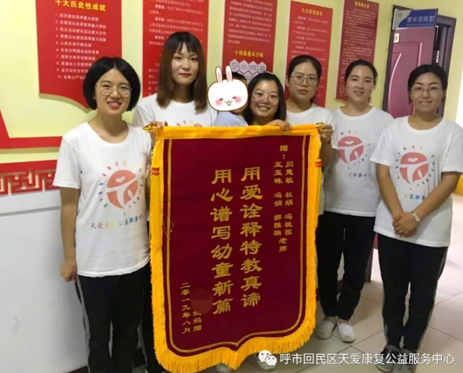 8月26日一大早,天爱康复公益服务中心MoMo(化名)妈妈给天爱6位老师送来锦旗,称赞老师“用爱诠释特教真谛,用心谱写幼童新篇”。