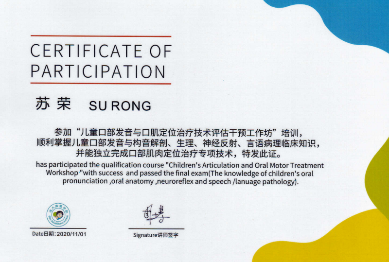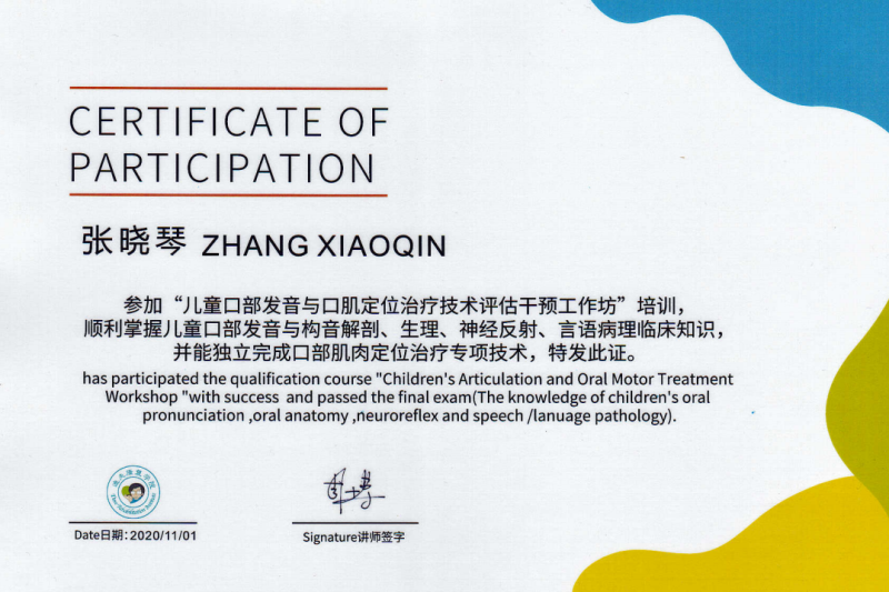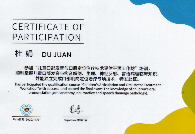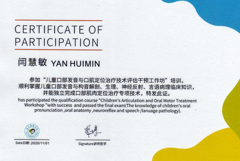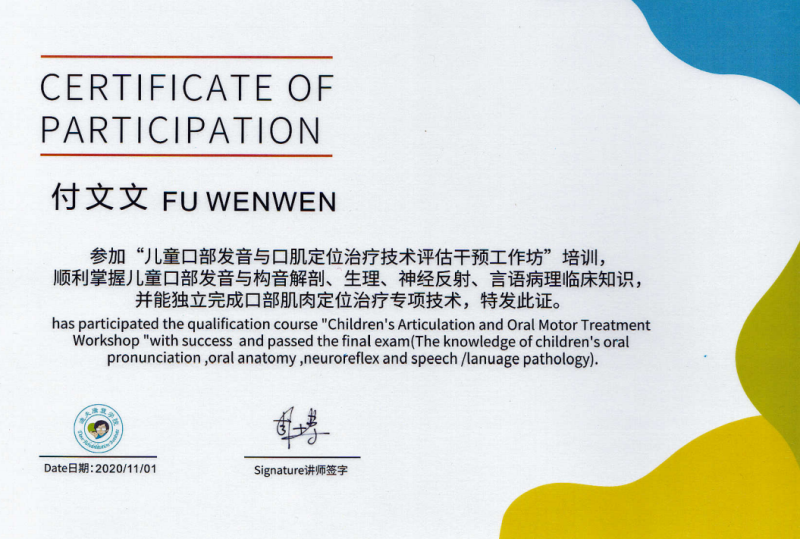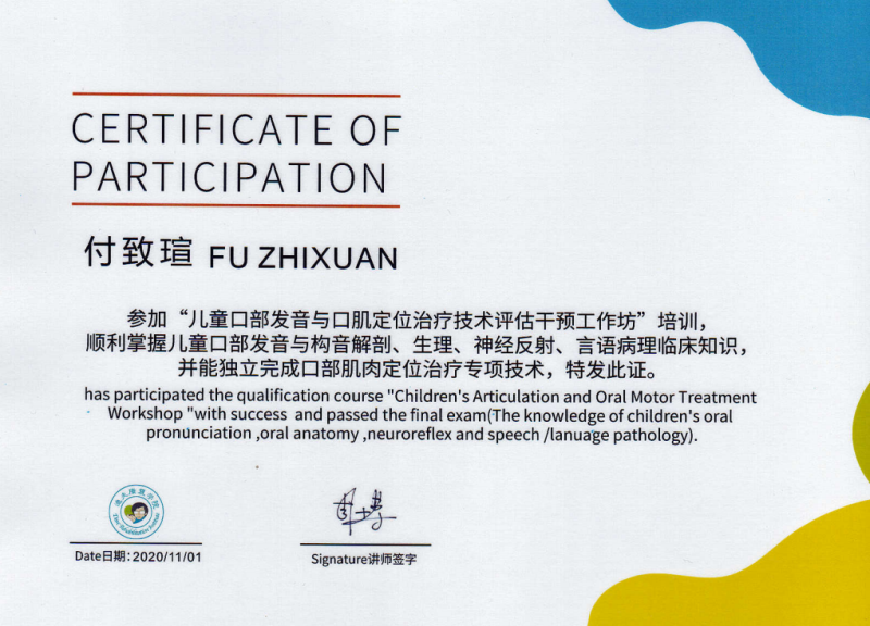 2020年10月31日天爱康复公益服务中心付致瑄、闫慧敏、杜娟、张晓琴、苏荣、付文文六位教师,远赴北京参加口部发音与口肌定位治疗技术工作坊。本次培训以儿童言语语言病理学知识为基础,让我们清楚的了解儿童发音、构音、口肌、口部定位的4模块的评估。经过培训学习六位教师顺利掌握儿童口部发音与构音解剖、生理、神经反射、言语病例临床知识,并能独立完成口部肌肉定位治疗专项技术。