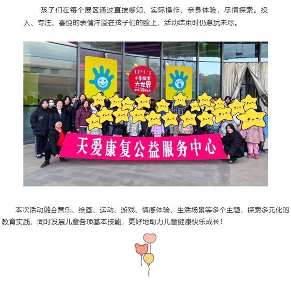 在2023年国际残疾人日来临之际,为了给孩子提供亲自实践、探索、发现的机会,天爱康复公益服务中心的教师们带领孩子和家长一同前往呼和浩特市“老牛儿童探索馆”,开启了一场探索之旅。